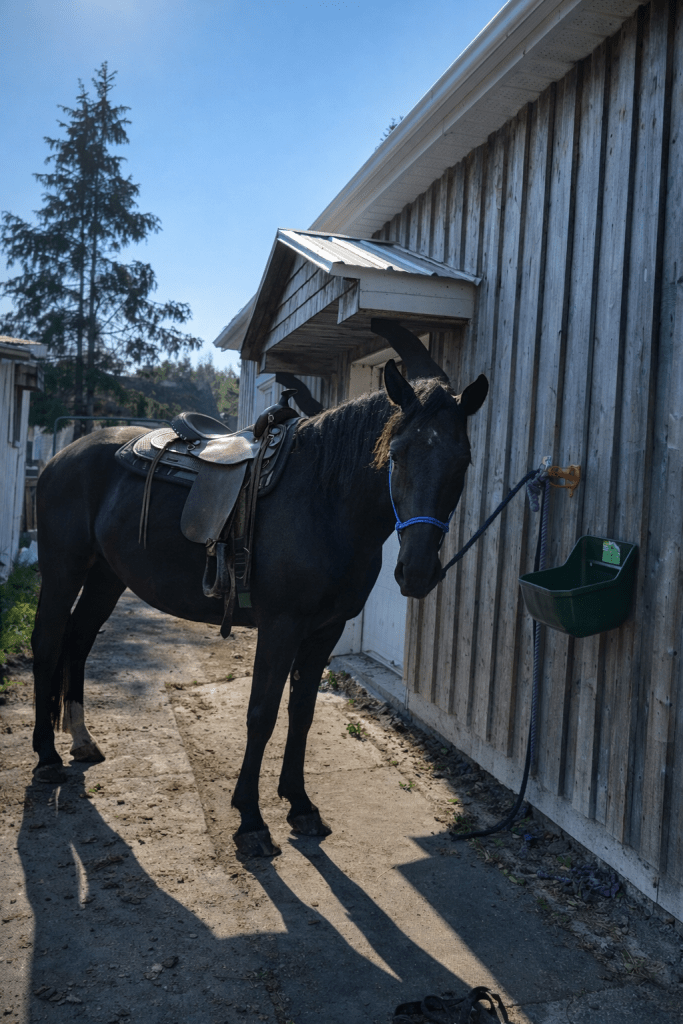 Le lendemain, tous les chevaux se dirigent vers leur mangeoire comme d’habitude… sauf le grand Dag. Il refuse complètement de mettre un sabot hors du paddock. (À noter que les chevaux vont se placer seuls à leur mangeoire — je ne fais qu’ouvrir la porte.)